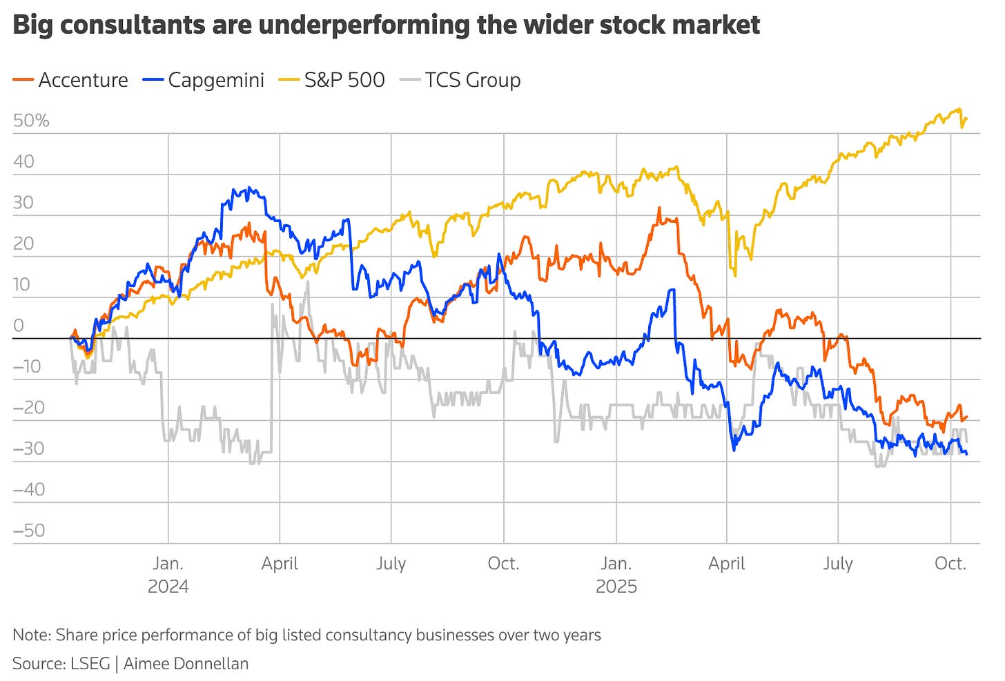 El gráfico de arriba muestra la evolución de tres empresas tecnológicas de servicios profesionales cotizadas. Pero las principales consultoras (big four, BCG, McKinsey…) son privadas y su evolución es más difícil de trazar. Muchas han anunciado despidos, pero también siguen contratando.