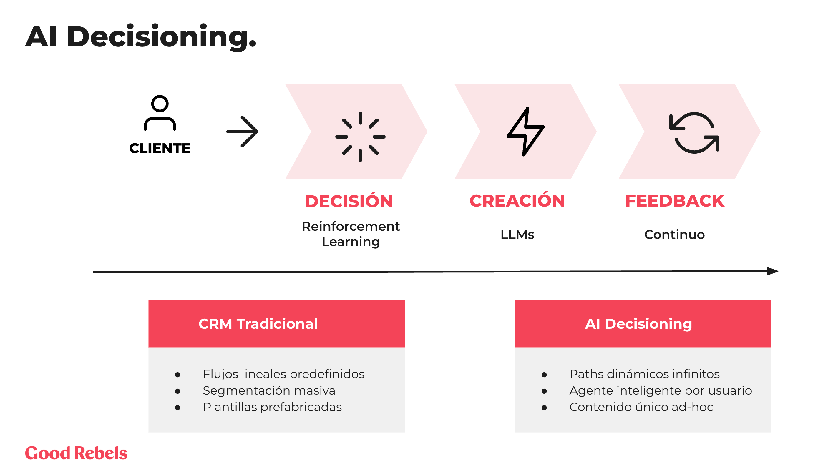 La irrupción de la IA generativa y los agentes autónomos ha roto este modelo. No estamos ante una mejora incremental, sino ante un cambio de paradigma en la arquitectura de decisión. Pasamos de orquestar campañas a desplegar sistemas de AI Decisioning: motores que no “lanzan” mensajes, sino que optimizan objetivos en tiempo real.