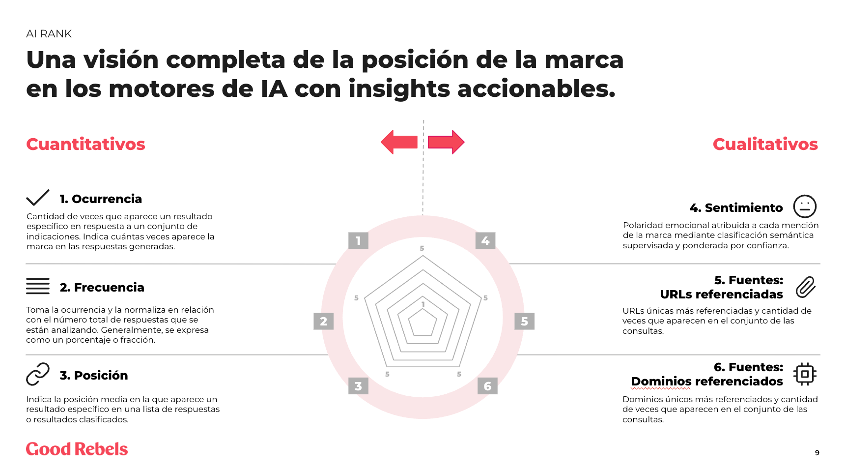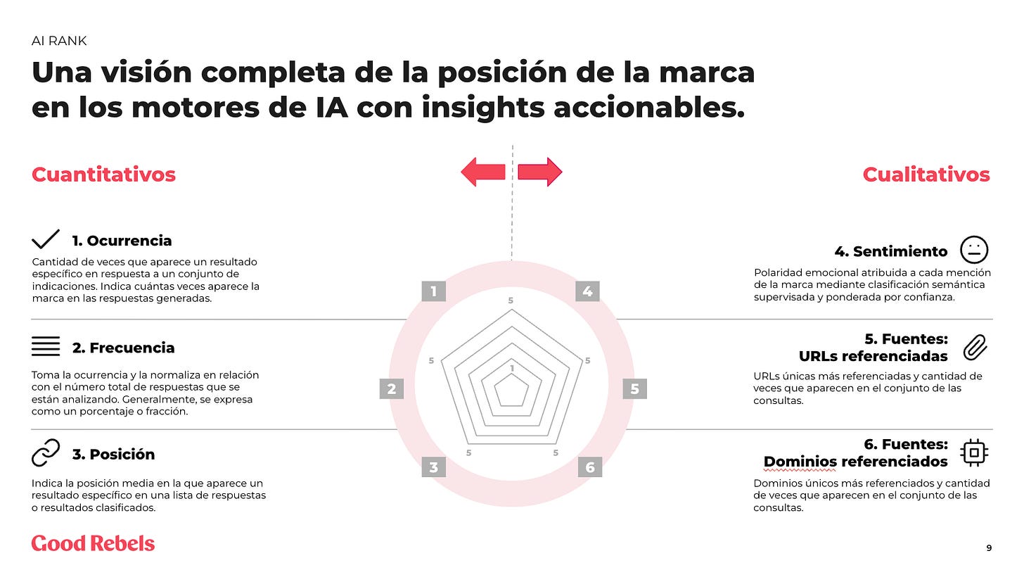 Capa de visibilidad: de ser encontrable a ser comprensible. El SEO tradicional optimizaba para el clic humano. El GEO (Generative Engine Optimization) opera con una lógica distinta: que un algoritmo comprenda la marca con suficiente precisión como para citarla como fuente de verdad. El GEO no premia la longitud del contenido ni la densidad de palabras clave; premia la publicación de datos originales, investigaciones propias y afirmaciones verificables con autoría clara. Una marca que publica estudios propios y datos de impacto medibles se convierte en fuente insustituible para el modelo. Una marca que solo publica contenido aspiracional -bonito, emocional, pero sin sustancia estructural- le pasa más desapercibido al algoritmo. La cuestión clave, es cómo medir esa visibilidad en un entorno que no ofrece métricas equivalentes a las del SEO clásico. Herramientas como AI Rank que hemos creado desde Kuantik, la división de IA de Good Rebels ya permiten monitorizar la presencia de marca en los principales LLMs -ocurrencia, posición, sentimiento, fuentes citadas-. Pero el ecosistema de medición está aún definiéndose.