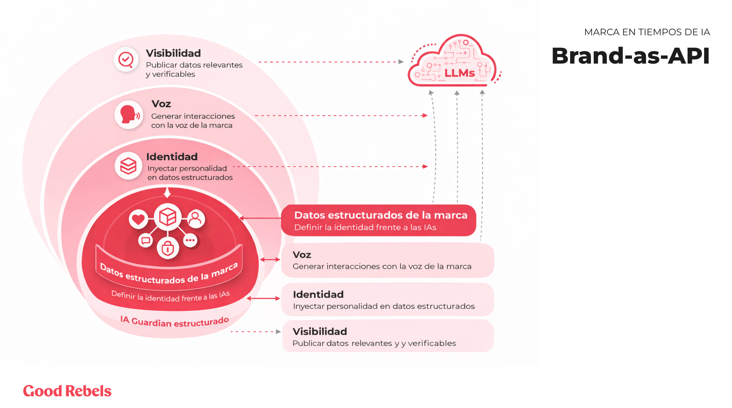 Capa organizativa: el rol que nadie tiene todavía. Hay una dimensión del Brand-as-API que aún no aparece en los organigramas pero empieza a ser urgente: la gobernanza de la identidad en entornos de IA. Las marcas necesitan definir quién es responsable de su identidad frente a los LLMs. No es IT, que gestiona la infraestructura. Ni marketing de contenidos, que produce el material. Es alguien en la intersección: capaz de entender la lógica de los LLMs y de traducir la identidad de marca a formatos que los modelos puedan consumir. No existe un nombre consolidado para este puesto, pero la necesidad es real.