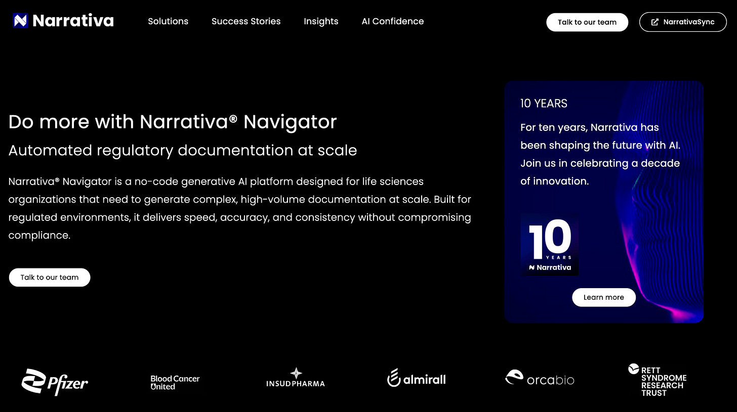 Más allá de los gigantes tecnológicos, una oleada de startups están convirtiendo la automatización en un producto empaquetado. Narrativa, una startup española que lleva trabajando en IA y generando texto de manera automática desde antes de la invención del Transformer en 2017, tiene soluciones para automatizar la creación de documentación regulatoria en la industria farmacéutica.