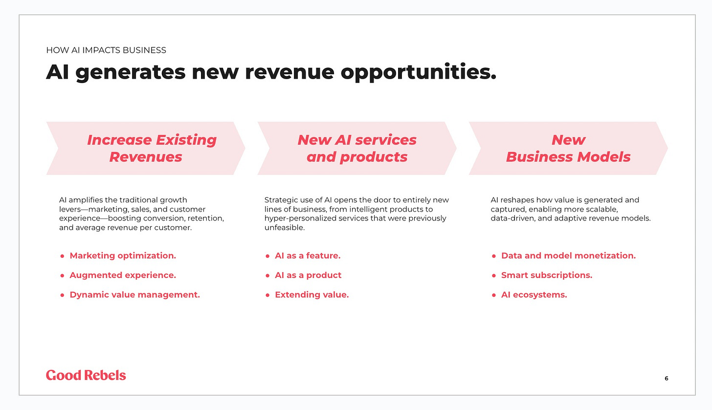 De aplicar la tecnología para ejecutar más eficientemente lo que ya hacíamos a redefinir las líneas de ingresos. En esta entrega, cómo usar la IA para definir nuevos productos y servicios.