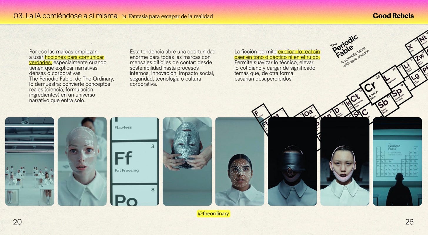 La ficción como refugio: ante la incapacidad de distinguir lo real de lo fake, el usuario prefiere la mentira honesta. Las marcas usan la IA para crear surrealismo explícito y fantasía. Si no puedes garantizar la realidad, ofrece una ficción tan evidentemente artificial que el consumidor baje la guardia. La IA explica aquí identidades corporativas complejas a través de narrativas imposibles.